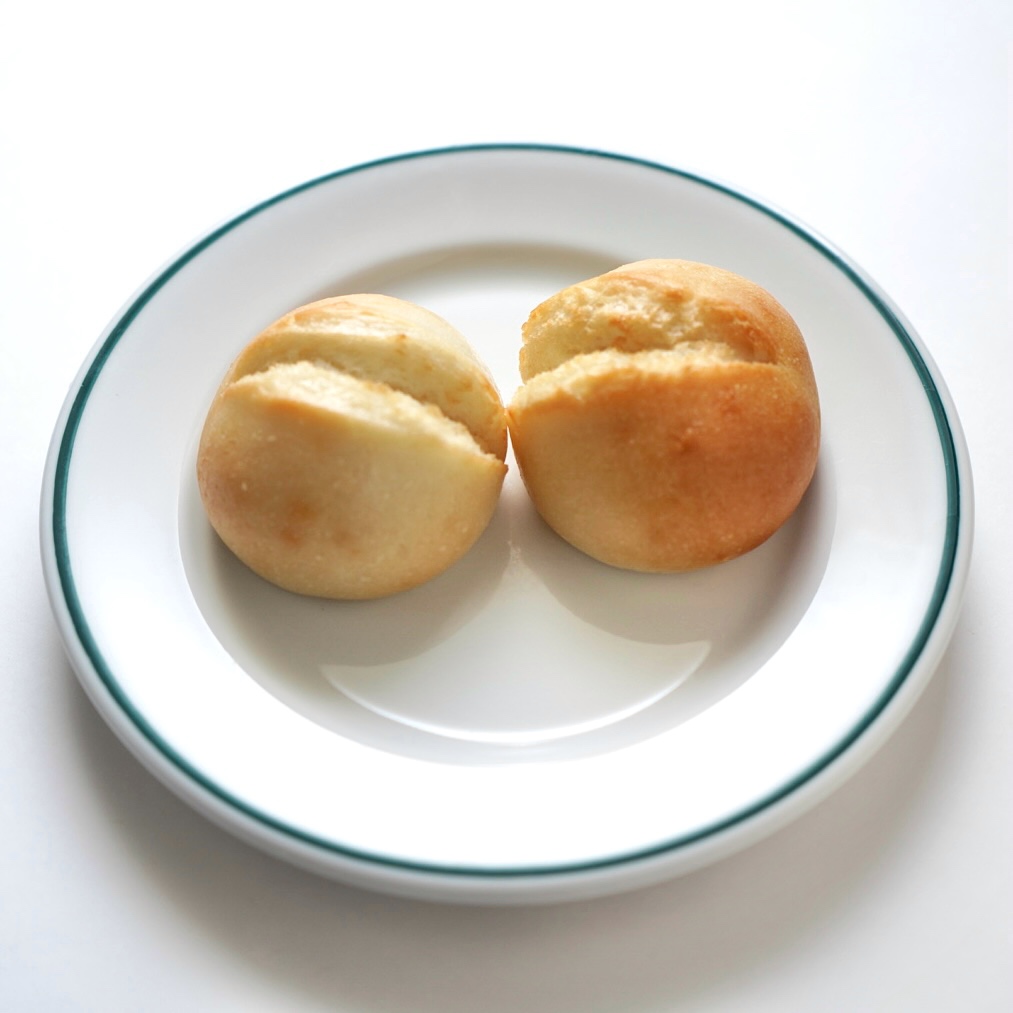 ラップで個包装されているので食べたい時にそのままレンジに入れられる。レンチンでもカリッと感が残って◎更にトースターでリベイクすると美味しさが増す。一個がずっしりしていてモチモチ系。クセがなく食べやすく、外と中の食感が違うので、口に入れた時の味わいがある。冷めると固くなるとのことだが、半日経っても特に気にならなかった。何を合わせても相性良し。