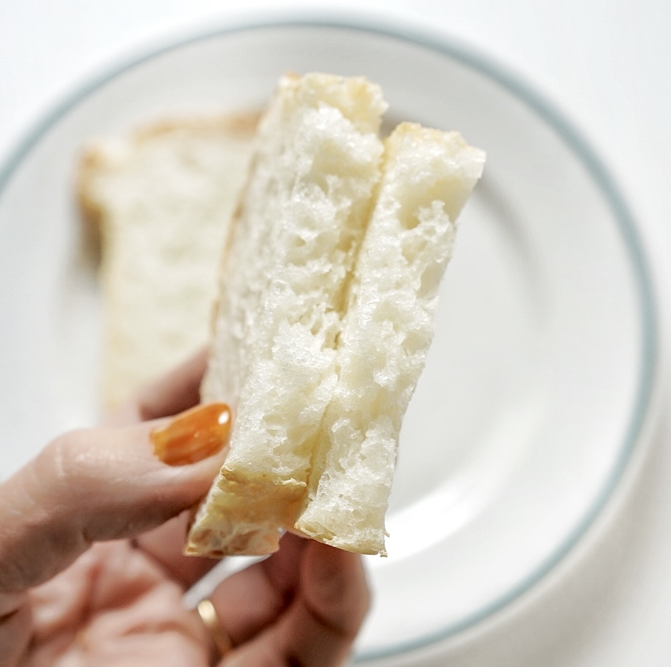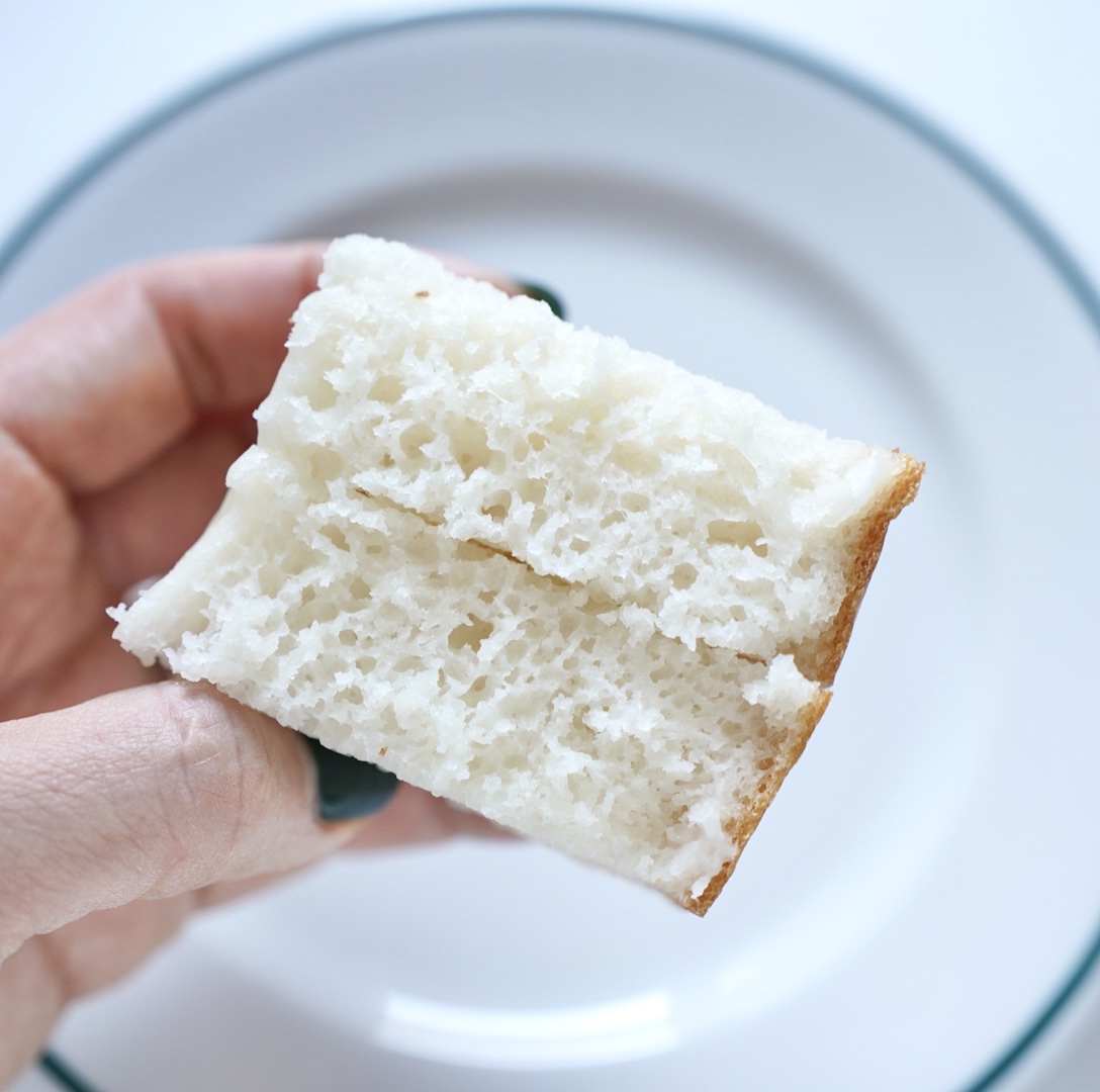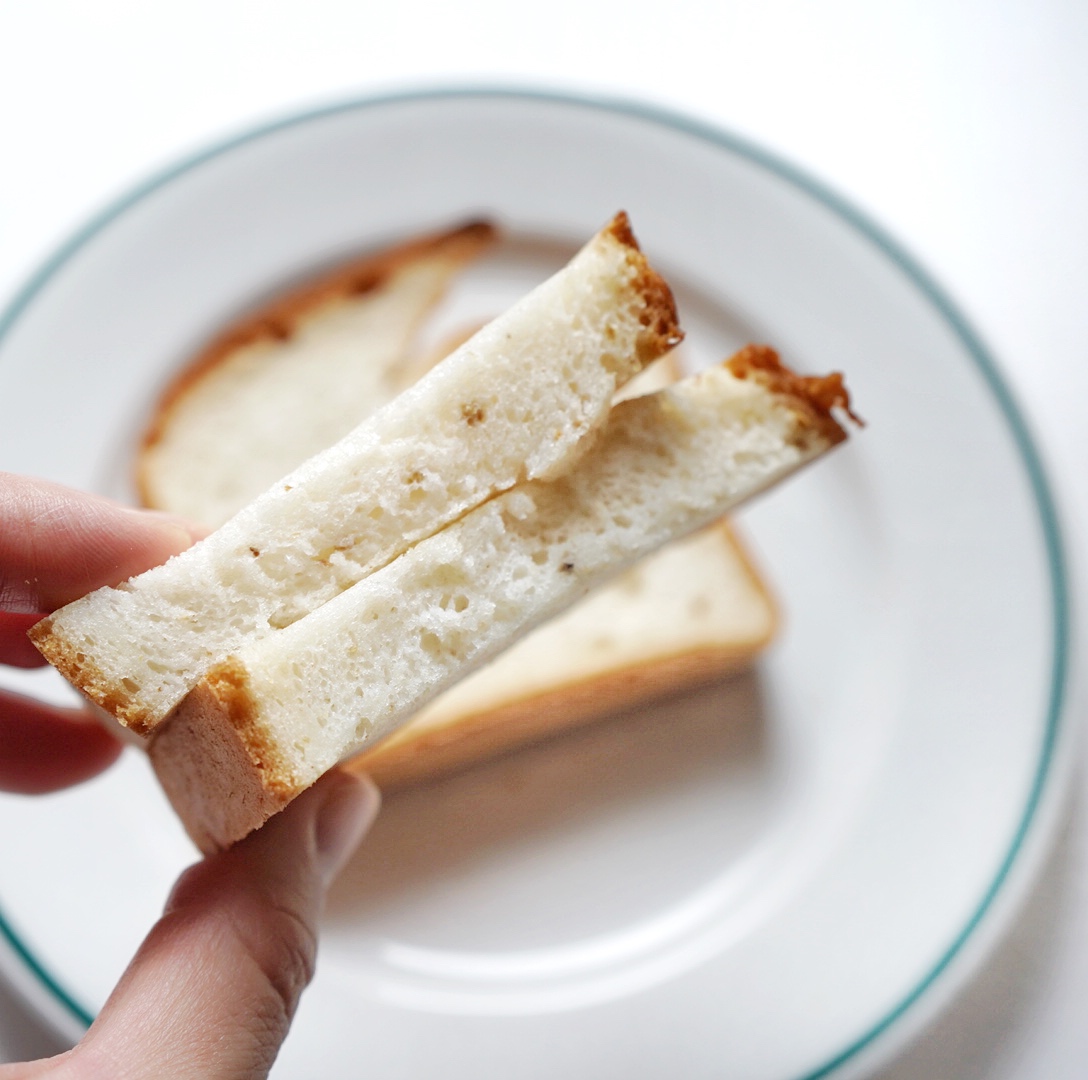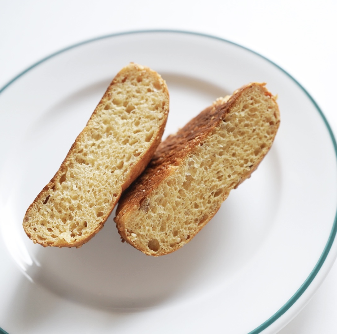 焼くとカリっと歯応えがよく、ずっしり重ためなので1枚でも十分食べ応えがある。加熱が少ないと米粉パン特有のぼそっとした感じが残るので加減が少し難しめ。一口目は少し独特の風味(米ぬか?)を感じるが、食べ進めると気にならない。食感がいいのでアボカドなど乗せてオープンサンドとして食べるのも良さそう。