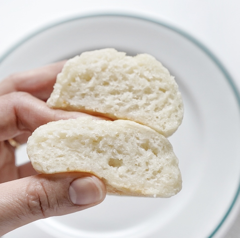 1つ1つラップで個包装されているので便利。食べ方はラップを外してレンチン。噛むとむぎゅっともちもちでカリッと感はないので、パンよりもお餅に近い印象。その分お腹にもずっしり食べ応えがある。もちもち故、バンズのように何かを挟んで食べるのには不向き。モチモチ派におすすめ。