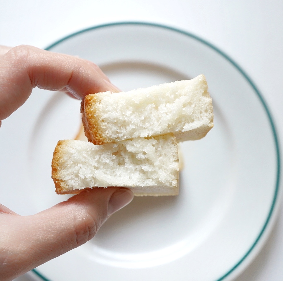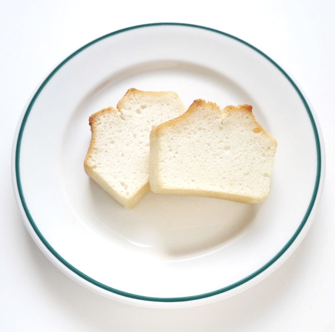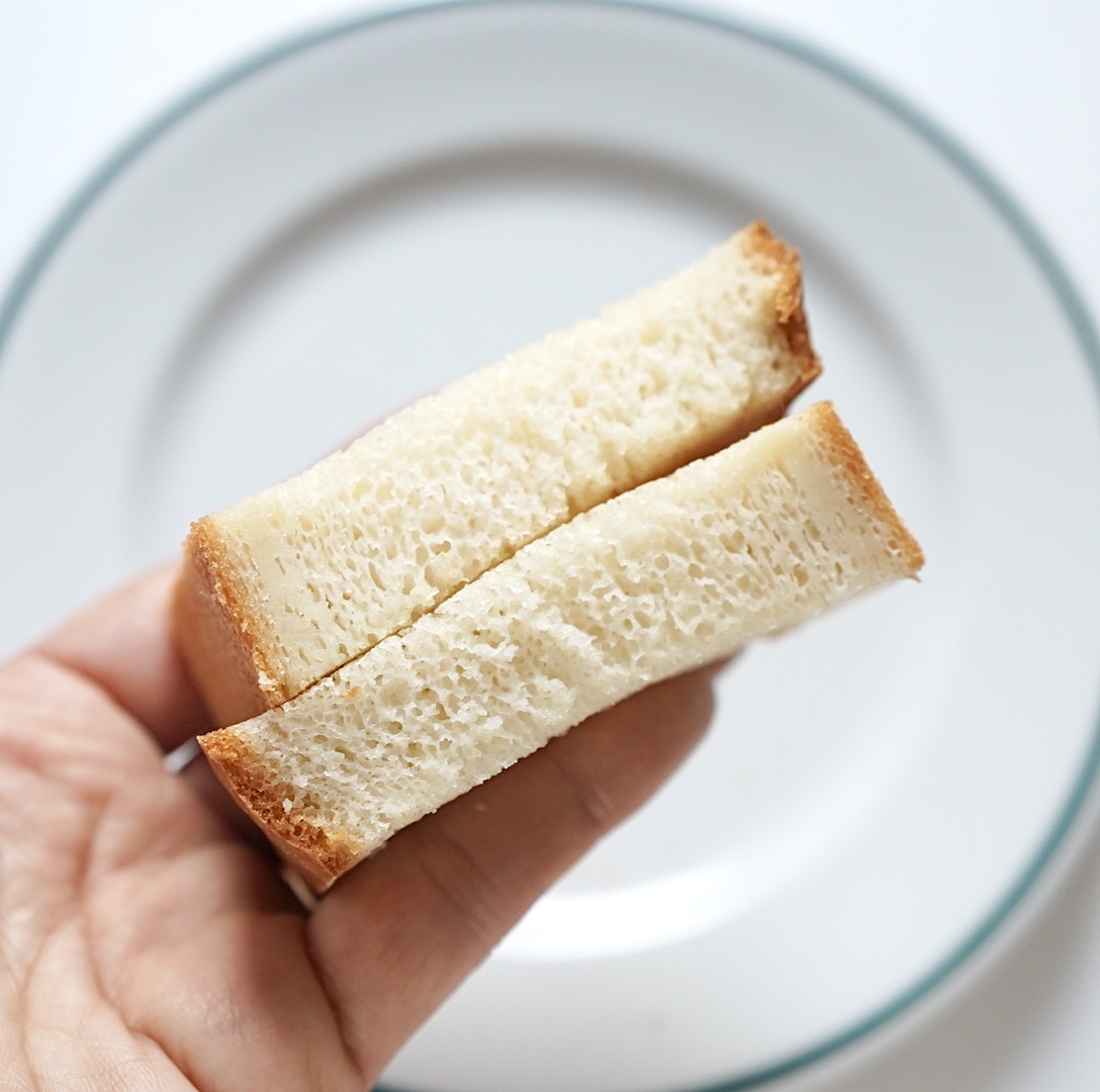 パウンド型で焼かれた珍しいタイプ。低音でじっくり焼くことが推奨されているので焼き方は少しコツが必要。上手に焼けるとふわっとかりっと食感が楽しめ、噛むとだんだんもちもち感が出て味わい深い。ちょっとオイリーで手がベタつくのと、少し時間が経つと食感と風味が落ちるのが残念。