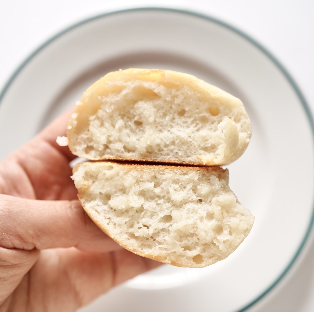 きめ細かい米粉が特徴。ずっしりさやもっちり感はなく軽いタイプ。小ぶりだが食べ応えがありお腹にしっかり溜まる。焼きが甘いとややパサつきを感じるため最初は焼き加減が難しい。常温で個包装なのでストックできるのも◎サンド系のフィリングと合わせるのがおすすめ。